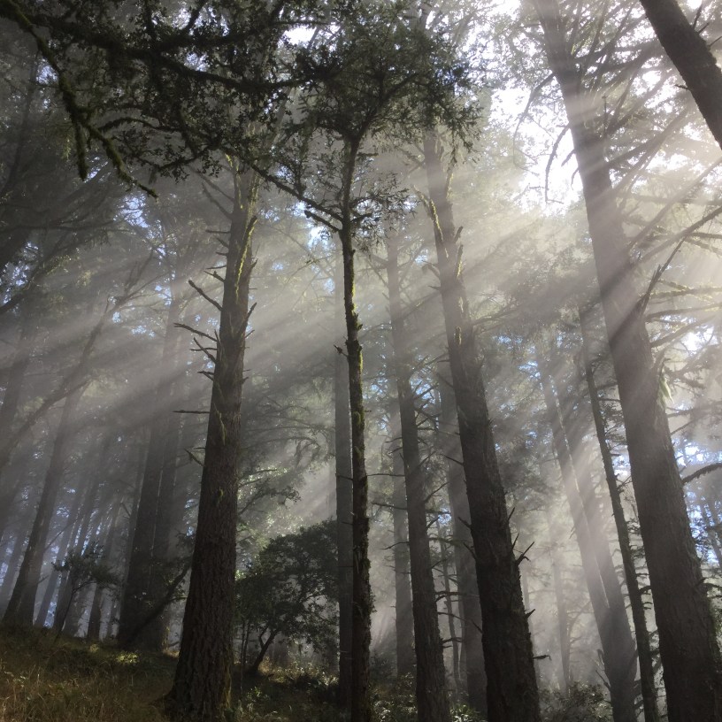 невероятная тишина взламывает мозг, пока буквально раздвигаешь туман руками и карабкаешься по тропинке к следующему просвету между деревьями. здесь птицы не поют, деревья не растут, и только мы плечом к плечу врастаем в землю тут. кстати, очень хорошая подбадривающая песня, хотя кто-то может счесть ее неподходящей для прогулки между секвойями. но только тот, кто не шел там и не извинялся перед деревьями.